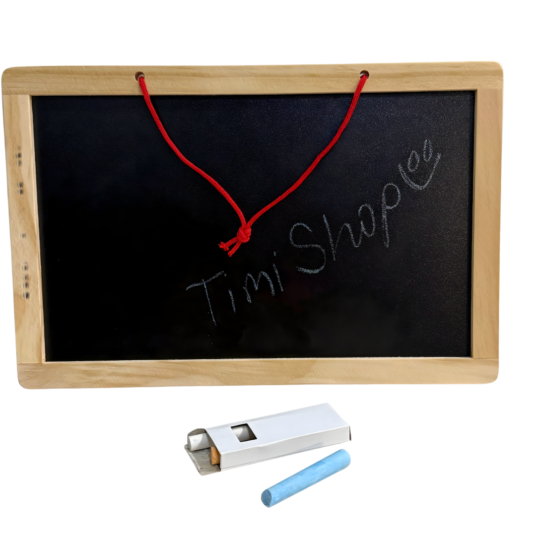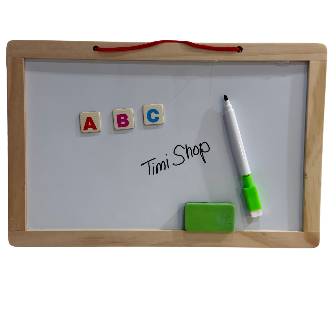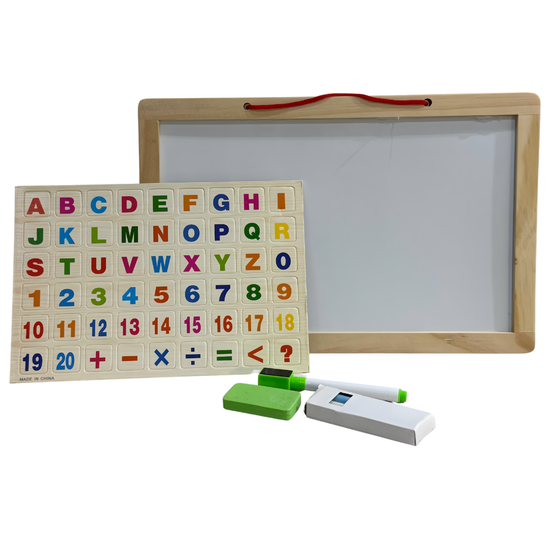 Edukativni set koji sadrži drvenu tablu sa dve strane – bela površina za pisanje markerom i crna površina za pisanje kredom. Tabla ima praktičan kanap za kačenje i idealna je za decu koja uče slova, brojeve i osnovne računske operacije.